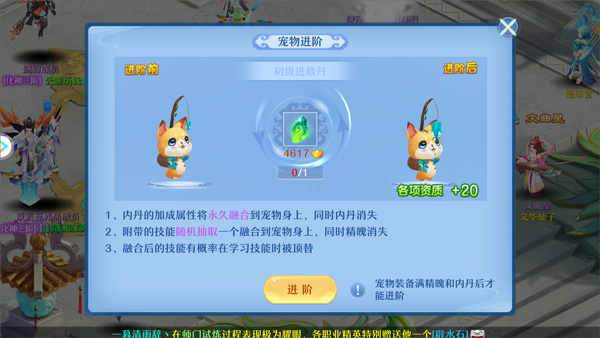 消耗特定的材料来使宠物进阶,可以将穿戴的精魄技能融合到宠物身上,使宠物更加强力。