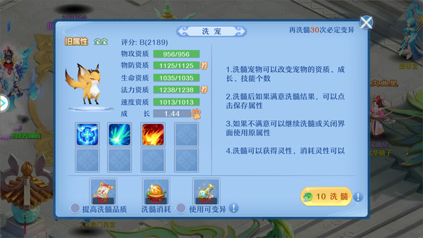 消耗返生丸可以改变宠物的资质和技能个数,对满意的洗髓结果可以保存。