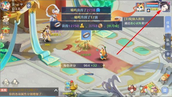 1、打开仙凡幻想九游版游戏,登录进入游戏页面,游戏主页可以看到玩家所处的位置,伙伴、技能、背包等功能键,点击右上角玩家头像;