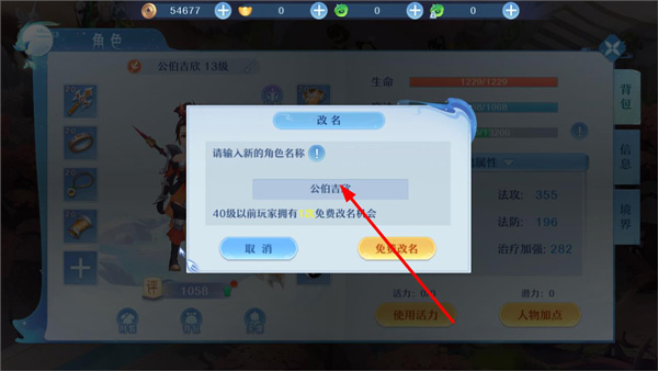 3、打开页面后,玩家可修改角色名称,40级以前的玩家拥有1次免费改名机会;