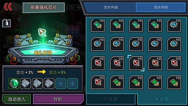 资源有限一定要主力培养一个英雄的芯片,定个目标比如单英雄,全紫芯片,全10级,完成一个英雄再着力下一个英雄,这样省操作时间。后期可以将主要属性的芯片等级堆高些。