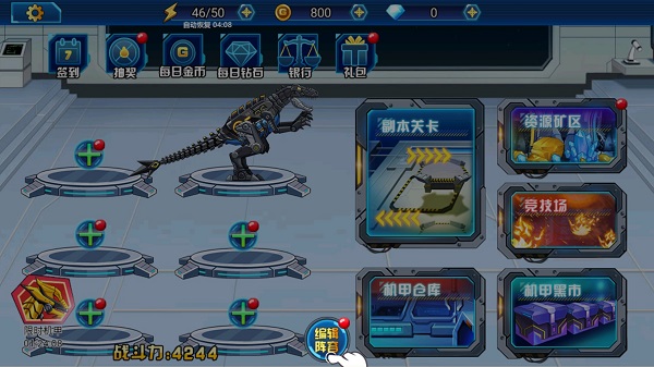 4、想要快速提升机甲战力,部件的购买和升级是必不可少的,现在你可以通过签到、抽奖、每日金币、每日钻石、银行和礼包,甚至包括游戏模式中的资源矿区来获得。