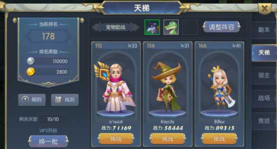 3、在第二个挑战天梯板块中,玩家每天有10次挑战机会,挑战胜利后,如果被挑战者的名次高于挑战者,则双方名次互换,每场战斗3分钟,超过时间则挑战者失败。需要击败所有敌对的目标方能获胜,名次越高奖励越好,天梯最多可出战3个英雄,出战的宠物可通过宠物布阵界面进行调整。