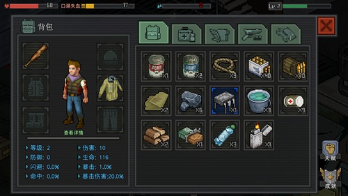 5、点击屏幕右下角的背包我们可以看到自己获得的材料和资源,有各种食物、水、血包等生存必需品,也有绳子、子弹、布料、打火机等道具。