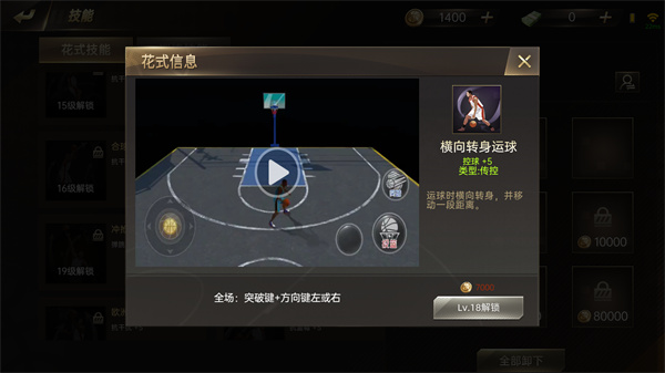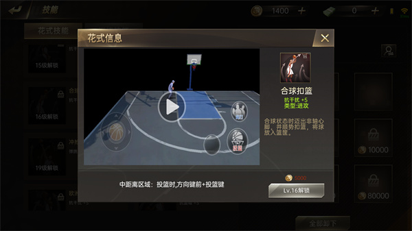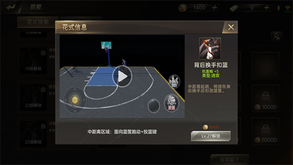 详情:中距离起跳,将球在身后换手后扣进篮筐