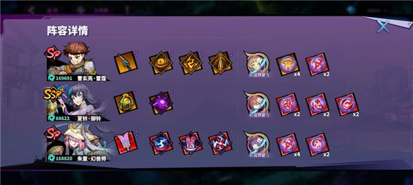 曹玄亮:等级拉满,全身黄技能(引力炸弹、雷光三舞、暴雨梨花,前后顺序即为优先精炼顺序)、黄武器、黄魂珠(开局6紫慢慢转成4临渊[1、2、4、6位]2紫)、黄月英(后面替换给幻兽师),不需要强行满精炼,所有被动要去刷的资源本全部刷曹玄亮即可
