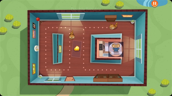 第三关,间谍鼠遇见了两只小黄猫。白色的虚线依然是两只猫咪的移动路线,玩法和第二关相似,都是跟在猫咪的后面,找到猫咪的视线盲区不被发现。其实只要掌握好时机和猫咪的移动规律,就能很轻松的避开小猫们的追捕,顺利到达奶酪的位置。