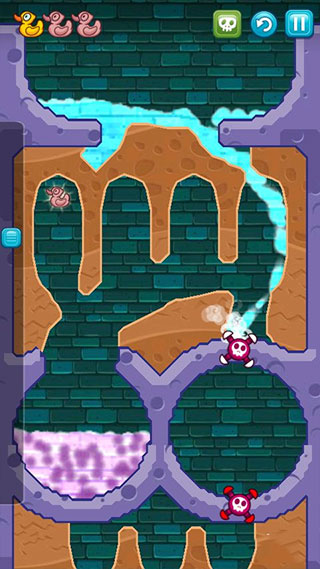 8、依照图示挖出一条路,把清水引导下来,让水流收集到最后一只鸭子,接着把水引入小顽皮的浴室,这样就能顺利过关。