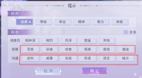 在“调查”、“传闻”等玩法中都需要通过使用各影迹对应的调查员来获得线索,分为【观察】、【沟通】、【研究】、【身手】四大类,点开【影迹详情】你会看到影迹的详细信息。
