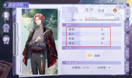 影迹的调查效果值是由4个属性计算得出的,每张影迹都拥有【精神】、【智力】、【体力】、【幸运】4种属性,不同的影迹还会有不同的属性偏向。【影迹详情】中的升级、进化、档案、培训是提升四个属性的养成功能。