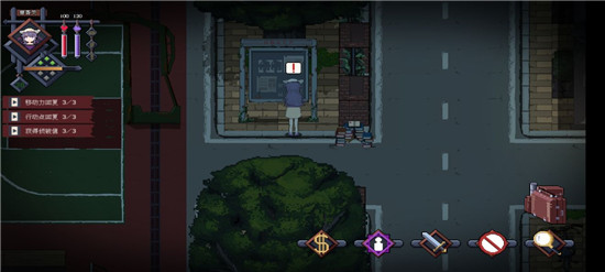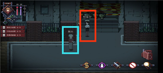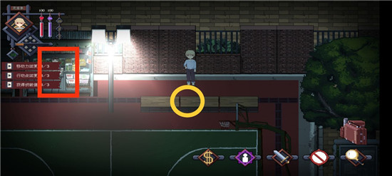 右下角的图标第一个是交易,就是队内协调物资用的,每个人物的行动轮能用一次,第二个是和左上角的三个小标做联动的相关判定位,序章用不到,第三个是战斗键,打架用的,会经常用到但是打一下就三点行动点,要注意。