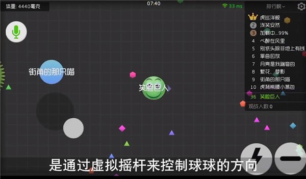 首先进入球球大作战游戏对局中,是通过虚拟摇杆来控制球球的方向