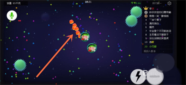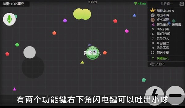 3、有两个功能键,右下角闪电键可以吐出小球来减轻自身体重加快移速,适用于被大球追逃跑时的技能,第二个减号,可以将自身体重分为两半,在逃跑时和追击时都较为适用