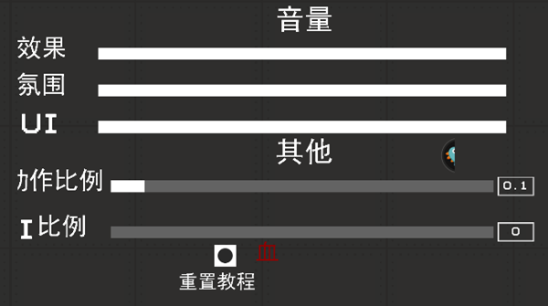 玩家可以设置效果、氛围、UI、力作比例、I比例等等,还能够重置教程。