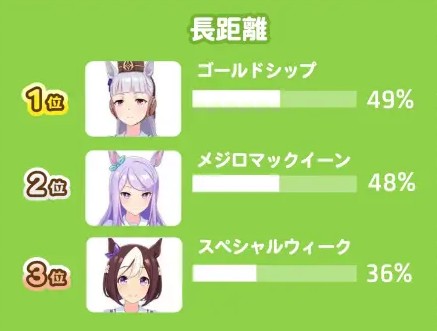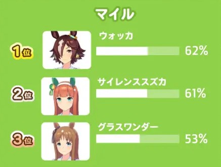 解析:中距离里的马娘竞争是比较激烈的,越来越多的马娘争相出场大放异彩,也导致马娘在出场率相较之前有大幅度的下滑。美浦波旁在榜,原本在列的小栗帽可惜被挤了出去。