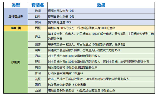这里大家可能注意到了【西装】套装既属于buff类也属于技能类,小编给大家解释下,西服套的效果【增加自身20%反伤,行动后回复自身10%的生命】:增加的反伤效果属于buff,当碰到其他友方给的同类型buff时,这个效果是不会叠加只会选择增益效果最大的生效;行动回复生命属于技能,只要触发套装效果角色每次的技能都会回血,不论是否触发反伤。