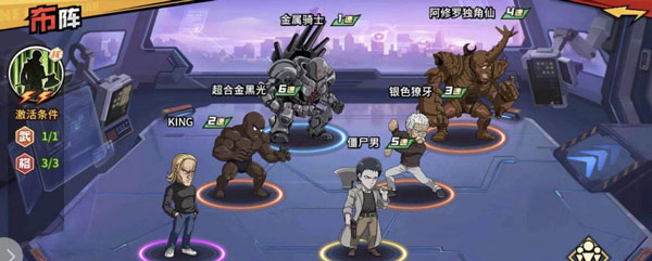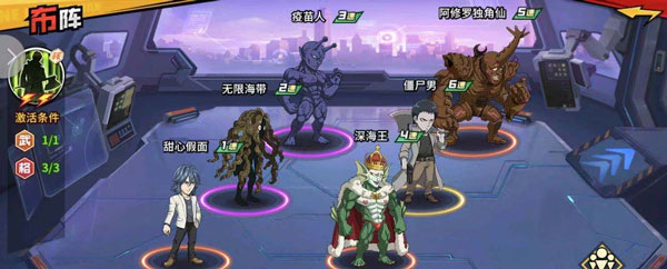 该阵容选择僵尸男核心。实战中甜心假面1速出手,无论是否被封火均可释放[受伤]状态回复2点能量。2速无限海带为敌方施加[酸蚀]效果,配合疫苗人被动削减敌方整体血量。3速疫苗人释放绝技可再次削减敌方前排血量,且有概率施加[灼烧]状态。4速深海王血<50%时,获取2点能量,也可补足[酸蚀]状态。5速阿修罗独角仙则通反弹伤害,进一步压低敌方整体血线。