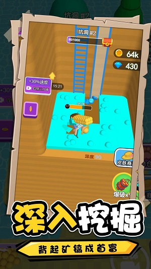 3.可以不断的升级我们的游戏装备来提高挖掘的能力,让我们可以更加快速的完成各种任务挑战,获得更多的成就。