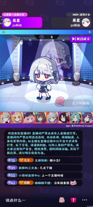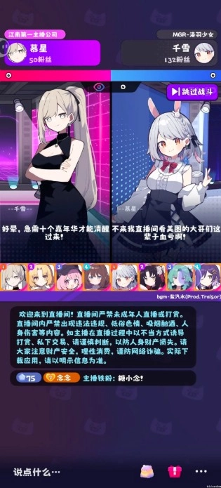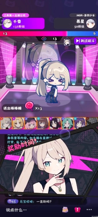 1、游戏采用二次元美术风格,角色设计精美讨喜,契合大众审美偏好。每位主播均拥有独一无二的性格特质、专属背景故事与特色技能设定。