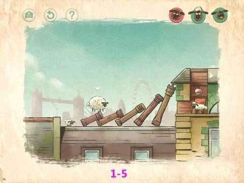 第1关:中羊推着小羊走到木头旁边,推几下,刚好能让木板横在悬崖上成为独木桥,三只羊过桥即可。
