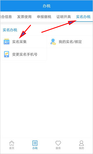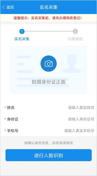 3、填好姓名、身份证和手机号后拍摄身份证正面,点击进行人脸识别进行实名采集,实名完之后,你就可以进行办税绑定啦。