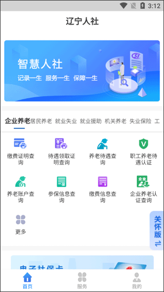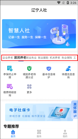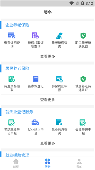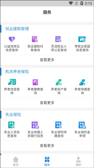 2、在首页有企业养老、居民养老、就业失业、就业援助、机关养老等功能