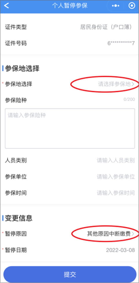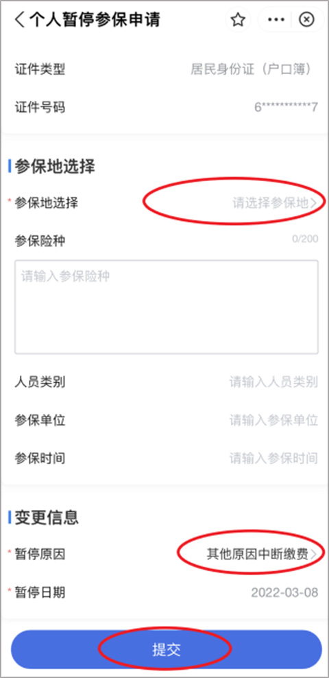 选择参保地:需要的参保地—暂停原因:其他原因中断缴费—提交—保存成功。