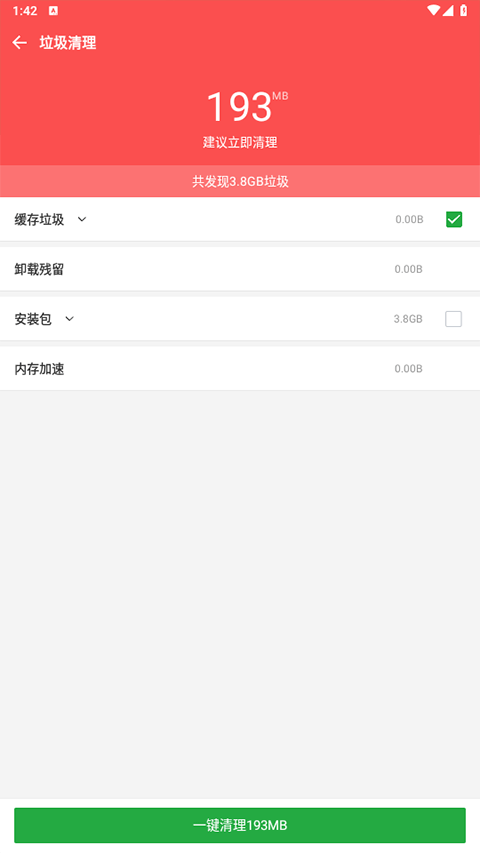 2、接着将会进入到垃圾清理界面,用户可以通过自己的需要选择清理缓存垃圾、选择残留、安装包与内存加速,小编默认将所有内容进行勾选,勾选完成后点击下方的“一键清理”选项清理垃圾,等待清理完成即可,如下图所示: