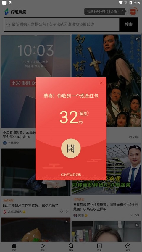 接着就是闪电搜索软件的界面了,说白了想要赚这32元红包,自然离不开完成里面的任务,完成的进度越高,赚到的红包自然越多,目前有以下任务可以做。