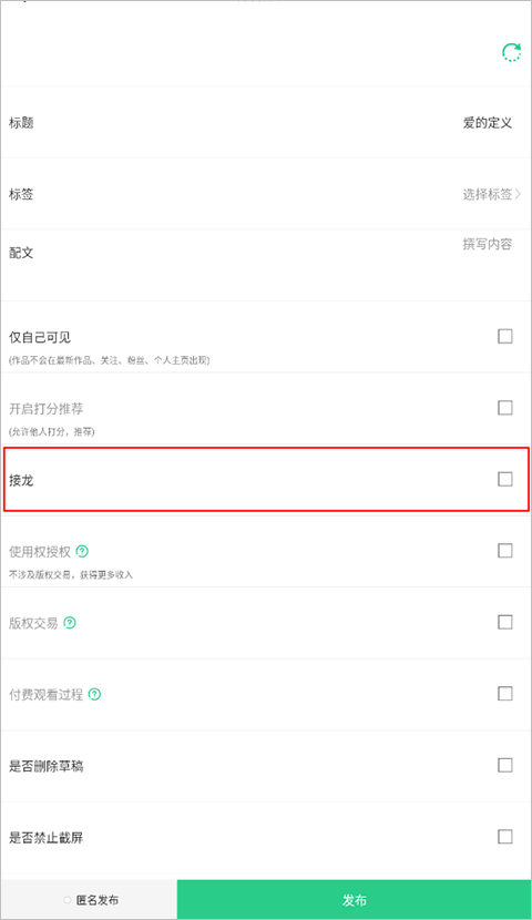 2、来到作品信息界面勾选下方的“接龙”(合绘),最后点击“发布”发布后即代表上传了作品哦!