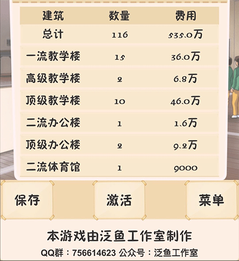 老师:主课有2名教师,负课一名教师。教导学生350名,但是进游戏时会是招生阶段,您可以用一万学费和零元的招生费招500名学生。招2年左右积累资金。(正式招人时学生数量会超出您的最终招收数量,因此您要学会拒绝)