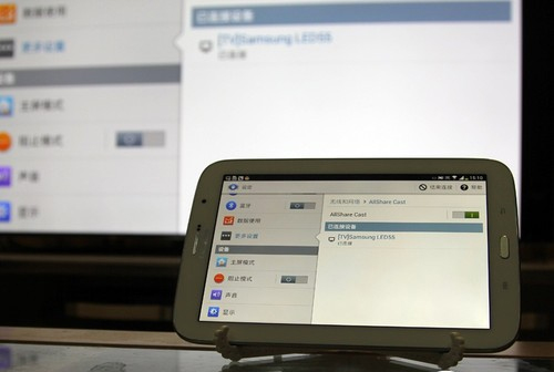 由于Allshare Cast是三星独家开发的功能,所以目前支持该功能的手机或平板仅有三星自家的Galaxy S3、Galaxy S4、Galaxy Note 2、Galaxy Note 10.1以及Galaxy Note 8.0等几款中高端产品,电视也只能选择三星品牌的智能电视。本次测试我们使用的机型为Galaxy Note 8.0平板与F8000智能电视产品。