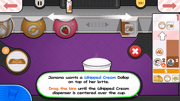 15、从小票左边的项目开始拖动容器,使左边的脱脂牛奶杯喷嘴在杯子上方居中。按住倒奶按钮继续添加脱脂牛奶!如果仪表接近红色区域,释放倒按钮,等待指针下降,然后再倒更多!