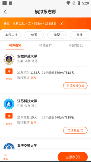 2、点击模拟智能填报,学生可以根据需求选择对应的地理位置,学院类型以及各专业等。