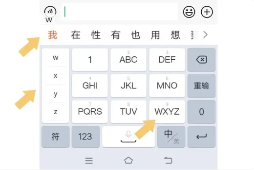 九宫格输入法的输入规则与26字母按键输入法规则不同,早些年的老式手机没有“智能联想”系统,需要用户手动调整和设置,而智能手机使用的输入法自带智能联想功能,不需要用户手动操作,只需要根据输入法提示的选项进行选择即可,以九宫格全拼输入法中的“九”按键为例,其对应的字母是“WXYZ”,此时我们只要点击这个按键,在虚拟键盘左侧就会自动出现四个选项,分别为W、X、Y、Z。如下图: