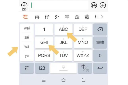 当按下这两个按键后,输入法会依据九宫格的按键组合,自动给出相应的联想全拼组合,像 wai、zai、wa、ya 等等。要是用户想打出“在”这个字,原本可以直接选择“zai”拼音。不过,由于输入法具备智能联想功能,而且“在”是常用汉字,所以它会自动出现在候选栏的最上方,用户直接选择“在”,该字就会呈现在输入对话框里了。