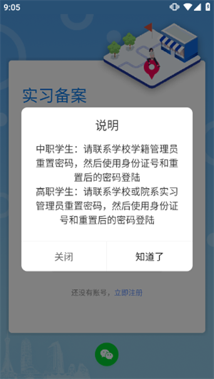 2、高职学生:请联系学校或院系实习管理员重置密码,然后使用身份证号和重置后的密码登录