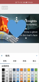 上面是单色填充,下面是渐变颜色,还支持图像、纹理等填充方式,电脑端的幻灯片的填充方式现在都可以在手机端上使用了