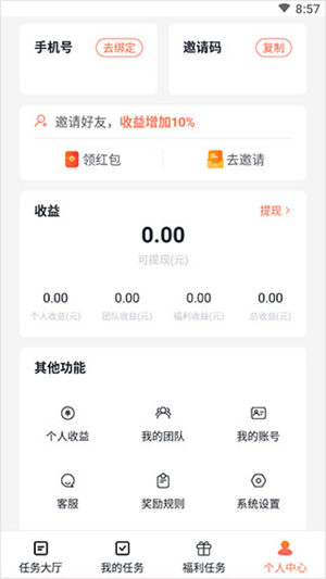 4、在个人中心可以看到自己的余额,以及拉人赚钱的方法等等。