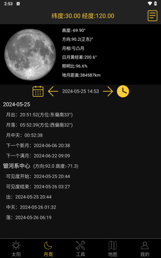 2、在风光天文摄影中,月亮往往是一个非常重要的因素,拍月亮的话肯定要了解到月相方位情况,不拍月亮的话,往往月光是一个最重要的光污染源,需要避开月亮在地平面上方的时间。