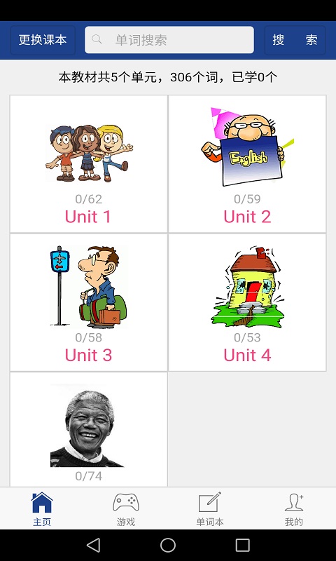 3.选择完版本后,可以浏览APP中提供的该版本的所有课本内容,包括单词表、课文等