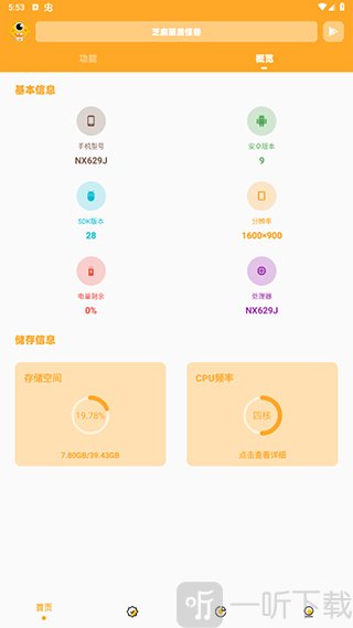 2、进入概览界面,可读取当前手机设备的型号、系统、分辨率、内存、CPU等信息,可以根据设备性能选择合适的画质。