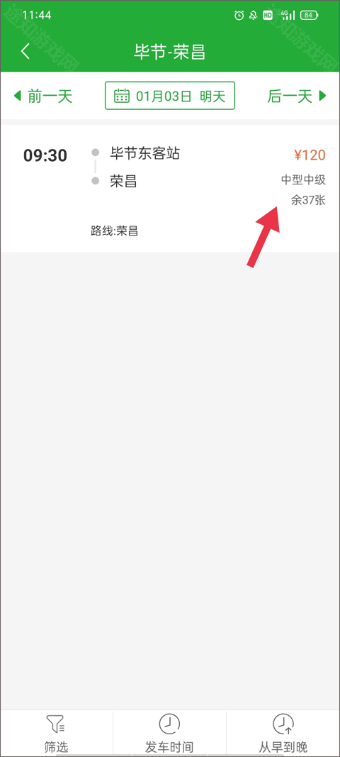 3、若当天无汽车票可预订,可选择次日进行预订操作,页面会显示从出发地到目的地该行程的车票数量及价格,点击其中一个即可。