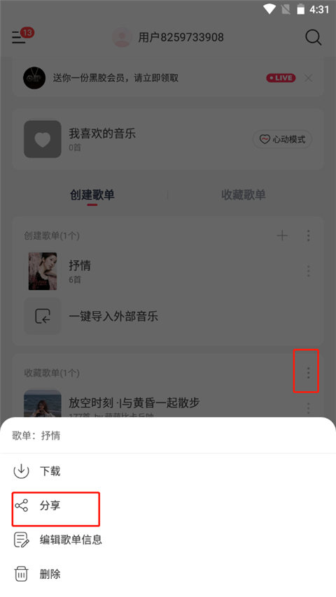 2、然后我们选择一个音乐平台导入歌单,如网易云,网易云我的界面后,点击你想要的歌单右方三个点,然后选择分享;