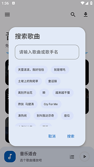 音乐适合是一款超火的音乐播放应用,整合了全网热门的歌曲资源,用户可以随时畅享听歌乐趣。它的智能推荐系统能帮用户轻松找到感兴趣的音乐,安装后就能免费聆听,欢迎体验!