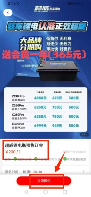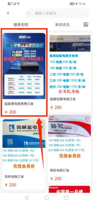 3、在商品列表中找到超威锂电瓶预订项目。