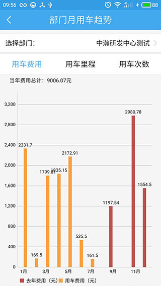 3、在这里可以查看部门月度用车的趋势,以及车费、里程等信息。