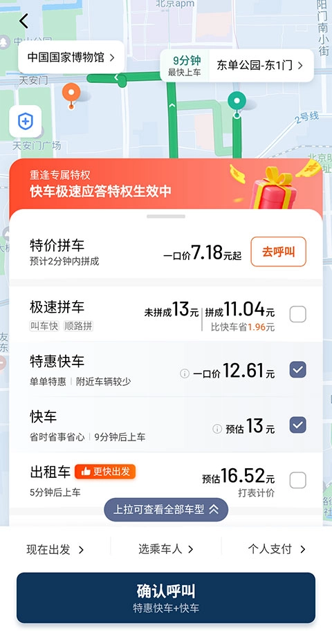 3、然后选择想要乘坐的车型,点击【确认呼叫】即可。