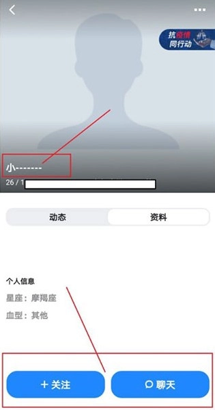 4、在该用户界面,可以点击底部的操作,进行关注或聊天。