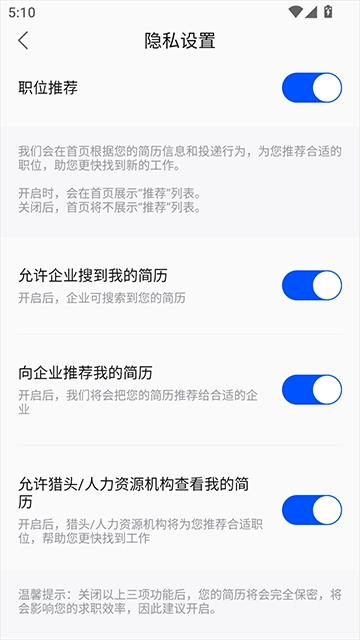 4、最后把“允许企业搜到我的简历”“向企业推荐我的简历”“允许猎头/人力资源机构查看我的简历”这三项全部关闭就可以了
